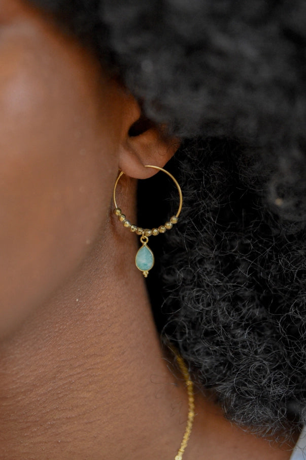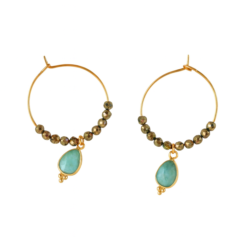 Diese wunderschönen, vergoldeten Creolen aus Edelstahl sind mit einem schimmernden Amazonit und Hämatit-Perlen verziert und verleihen jeder Frau einen sanften, harmonisierenden und zugleich kraftvollen Ausdruck.