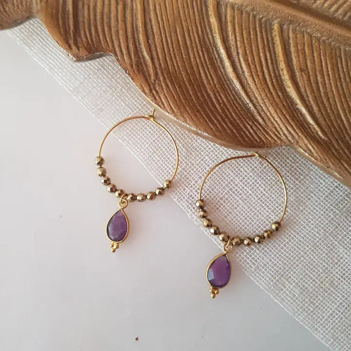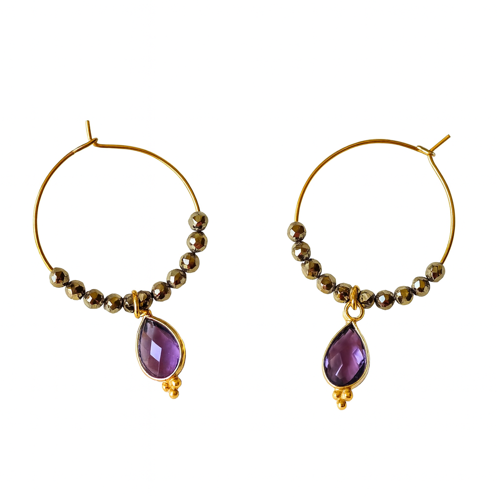 Diese wunderschönen, vergoldeten Creolen aus Edelstahl sind mit einem edlen Amethysten und Hämatit-Perlen verziert und verleihen jeder Frau einen kraftvollen, zugleich spirituellen und eleganten Look.