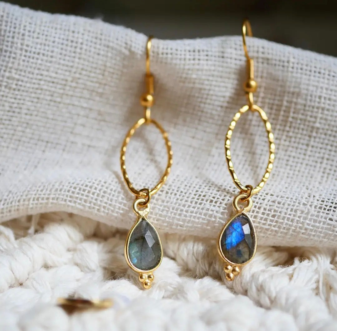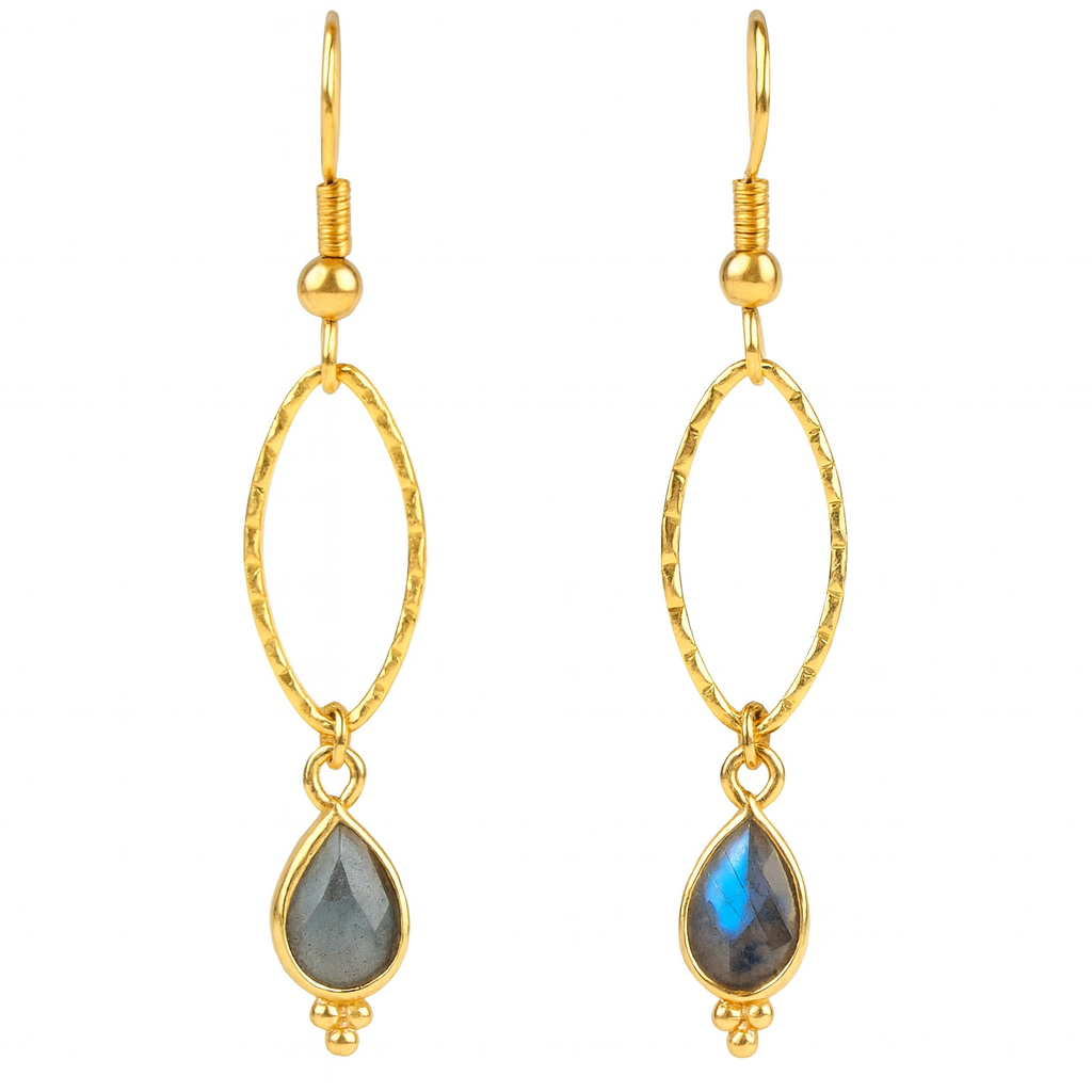 Facettierte Labradorit-Tropfen, eingefasst in vergoldetem Edelstahl, schwingen sanft unter einem länglichen, strukturierten Oval.