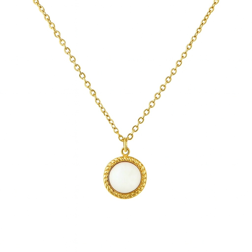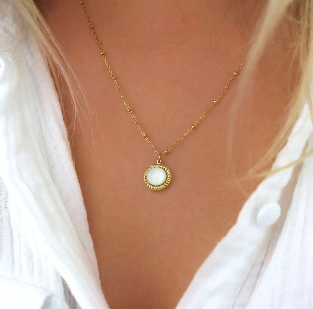 Der sanfte Schimmer des echten Perlmutts wird von einer gedrehten, goldfarbenen Fassung aus Edelstahl umrahmt, die seinen natürlichen Glanz und die feinen Farbnuancen perfekt zur Geltung bringt. Die perlenbesetzte Kette unterstreicht den edlen Charakter dieses zeitlosen Schmuckstücks.