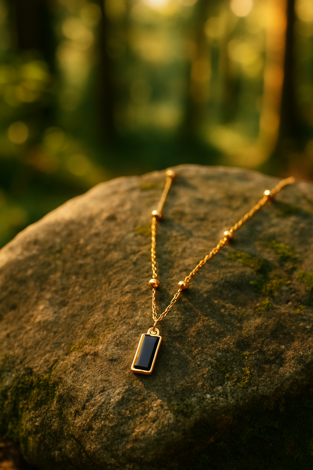 Diese Damenhalskette besteht aus kleinen Kugeln, die liebevoll in die Kette integriert wurden und einem Naturedelstein, dem Onyx, der rechteckig geschliffen wurde und für seine stabilisierende Wirkung bekannt ist. Das Armband hat eine kleine 5-cm-Verstellkette, sodass es Spielraum in der Länge ermöglicht. Ein perfektes Geschenk für jede Frau. Schauen Sie auch unbedingt in unsere Kategorie „Bundles“ um Geld zu sparen.