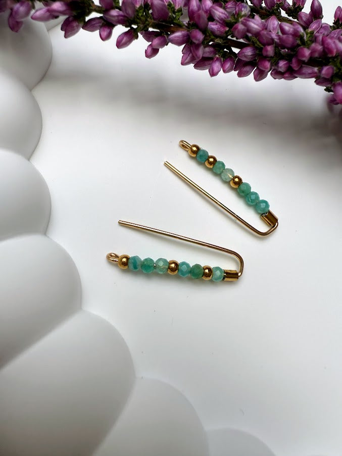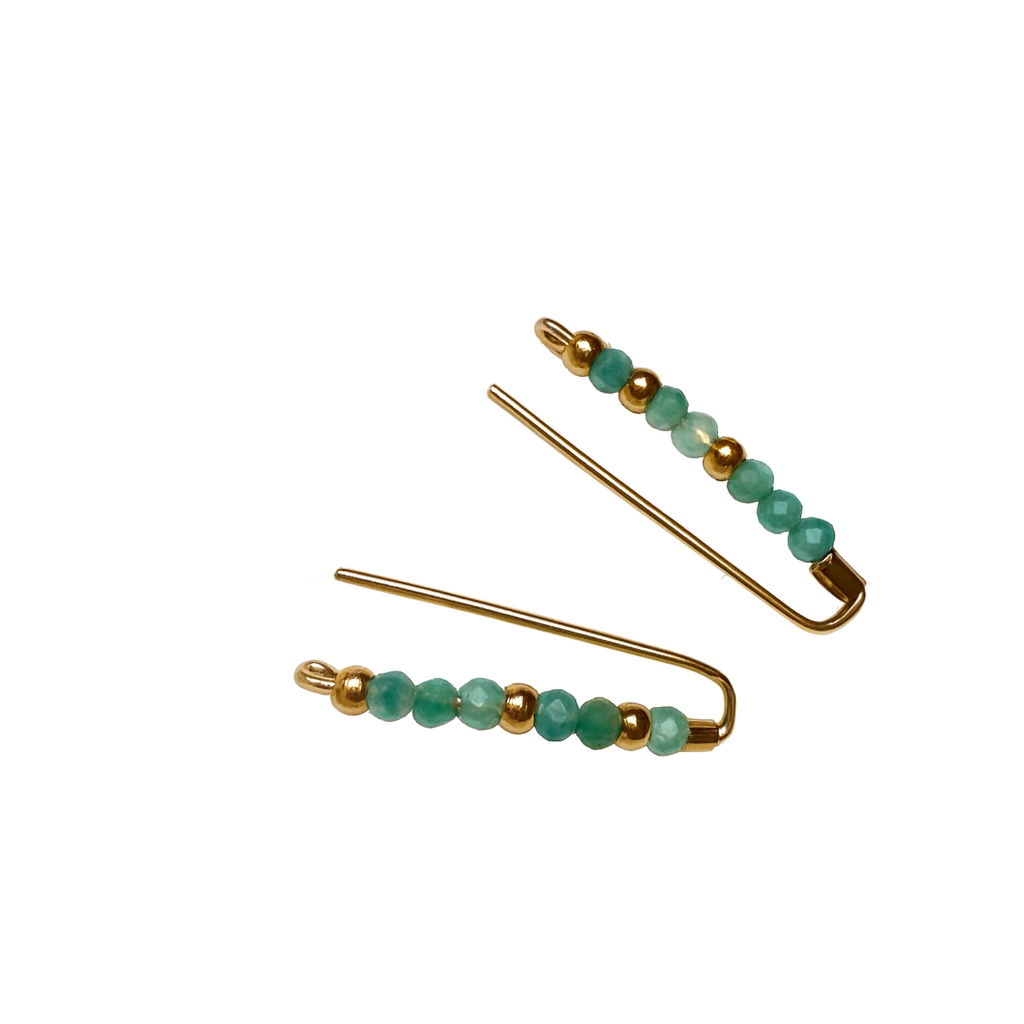 Fein gearbeitete Outline-Ohrringe aus hochwertigem, goldgefülltem Edelstahl, vollendet mit sanft glänzenden Goldperlen und natürlichen Amazonit-Edelsteinperlen.